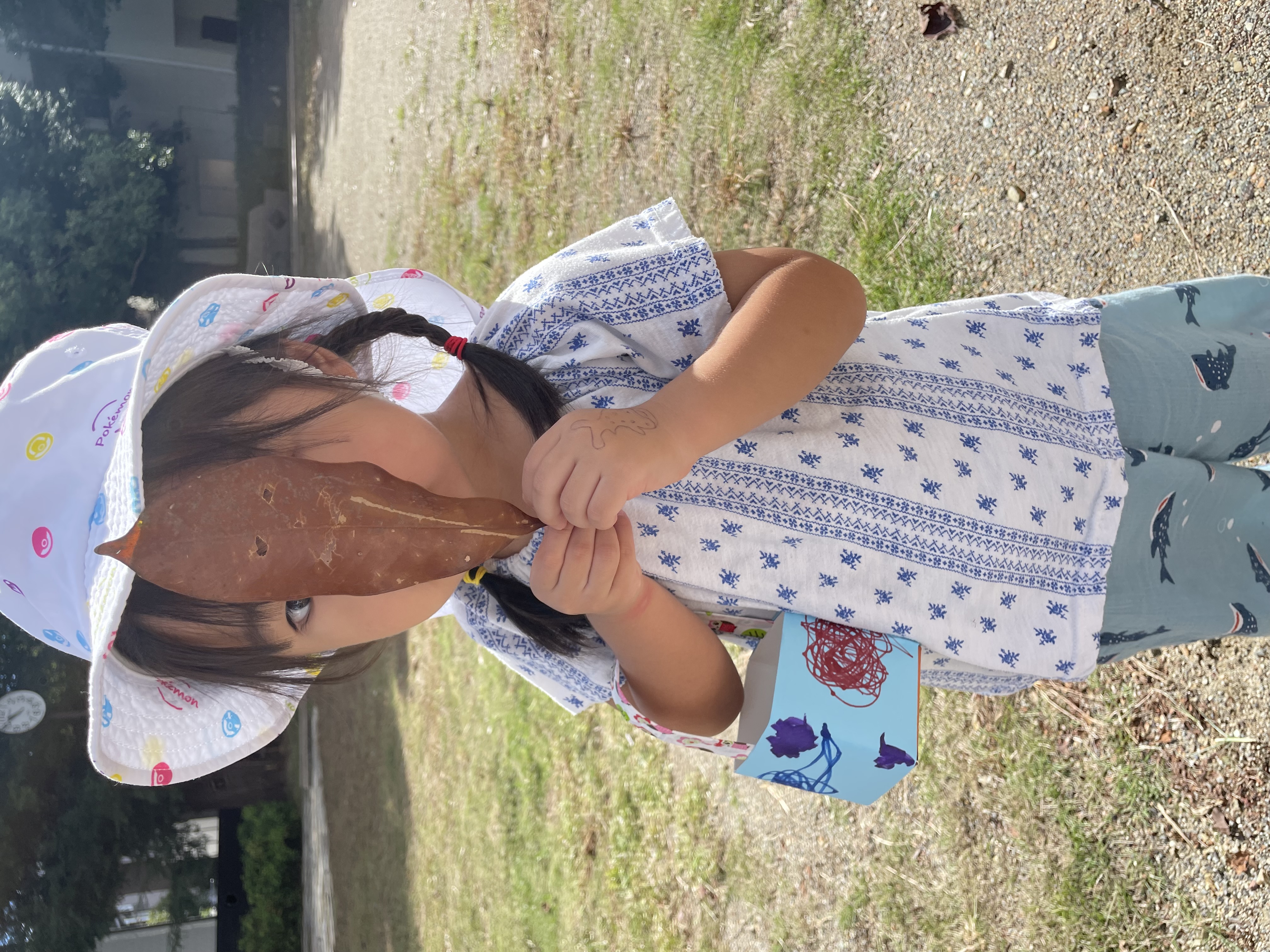 大きな落ち葉を見つけて、葉っぱのお顏だよ。
