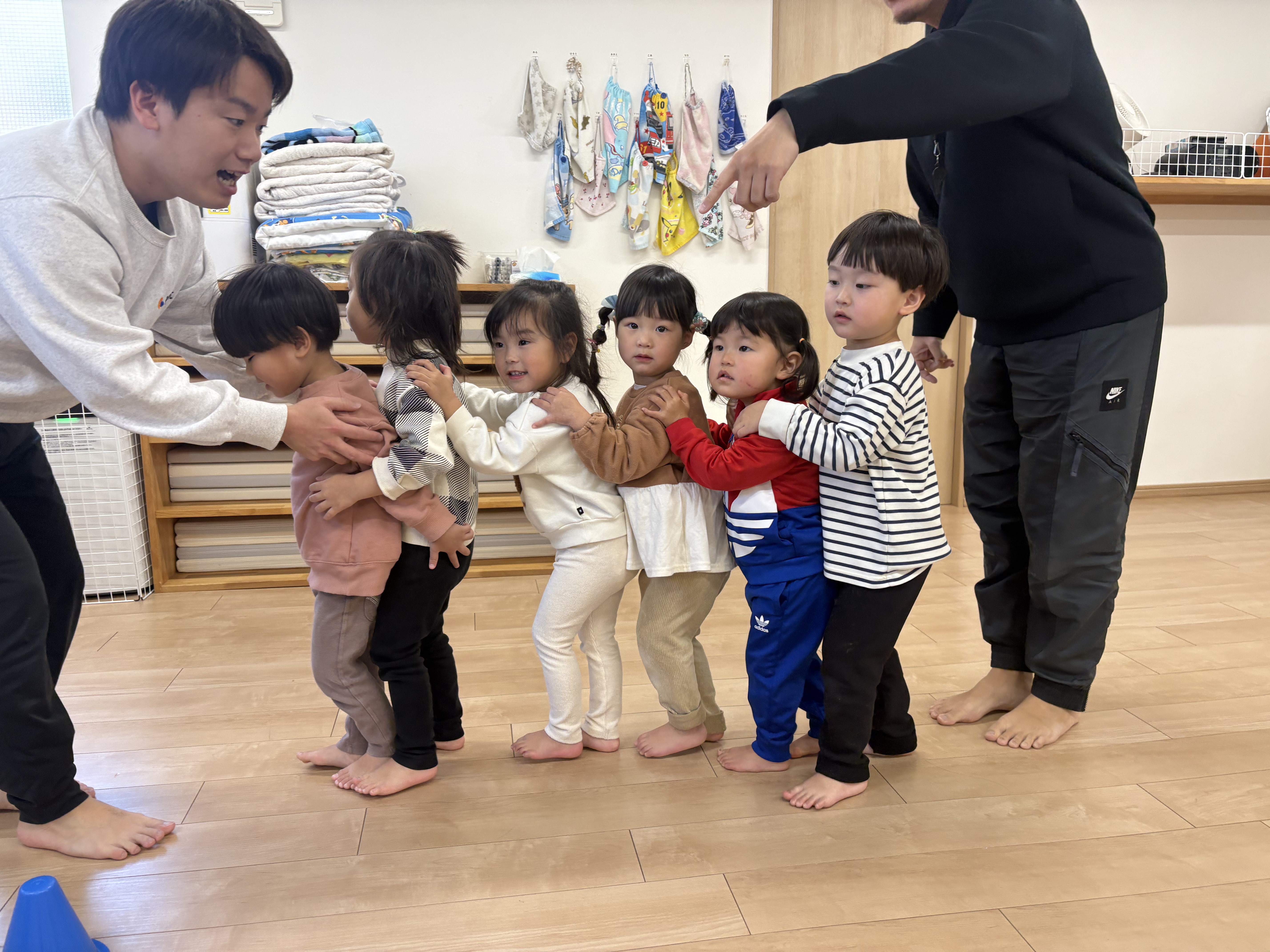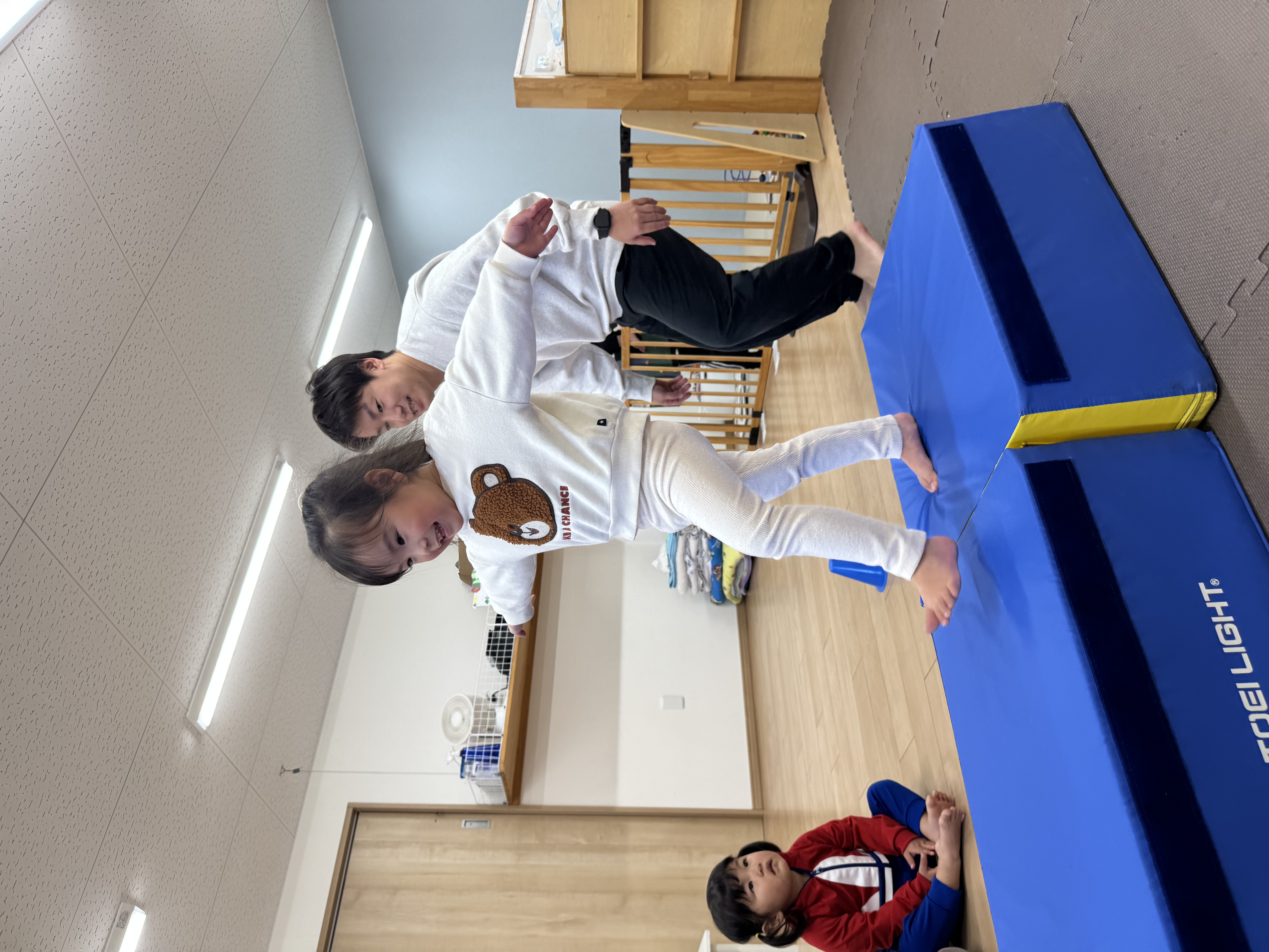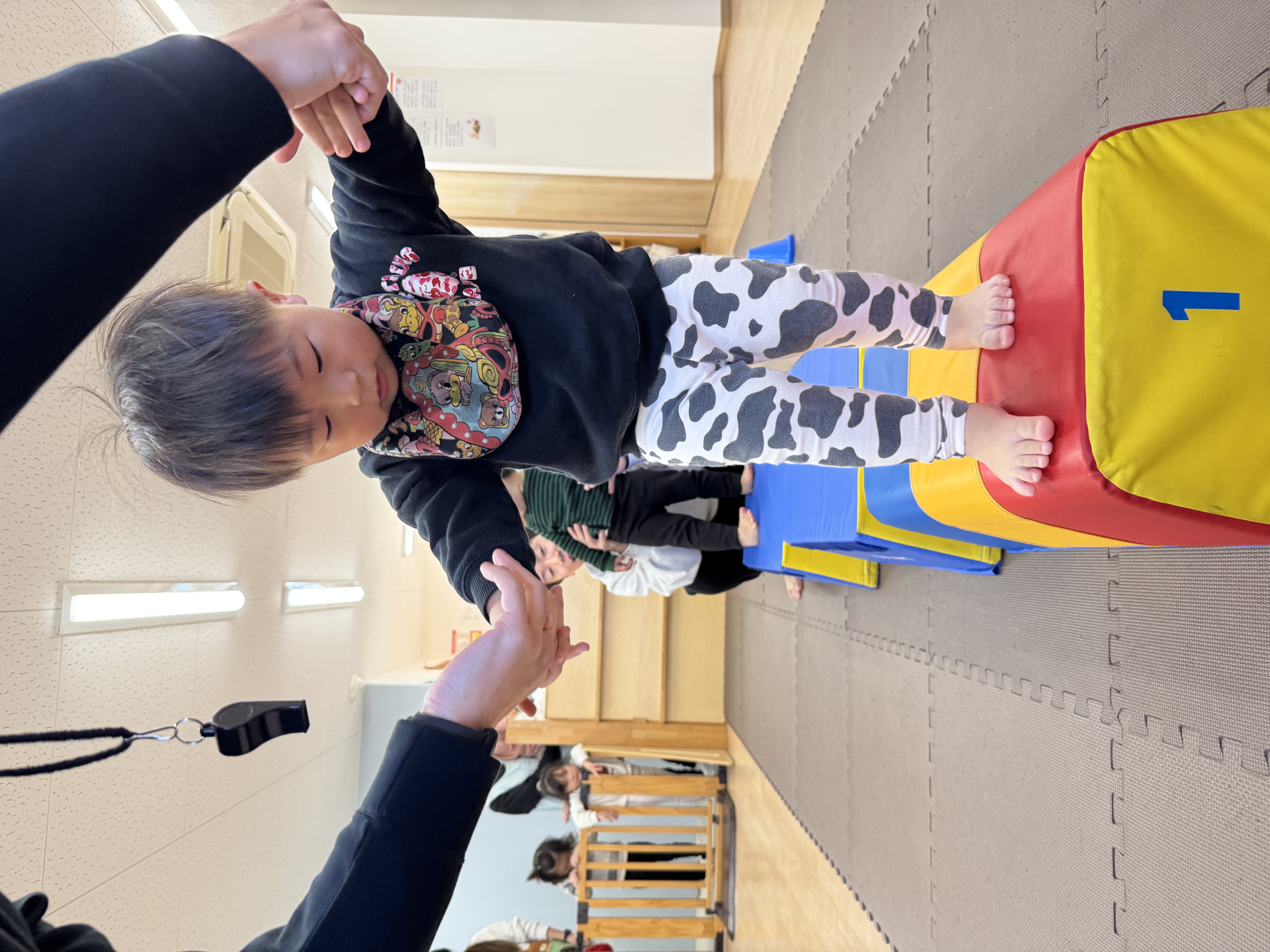 先生と手を繋いで”おっとっと~落ちないように”台の上を歩いたり