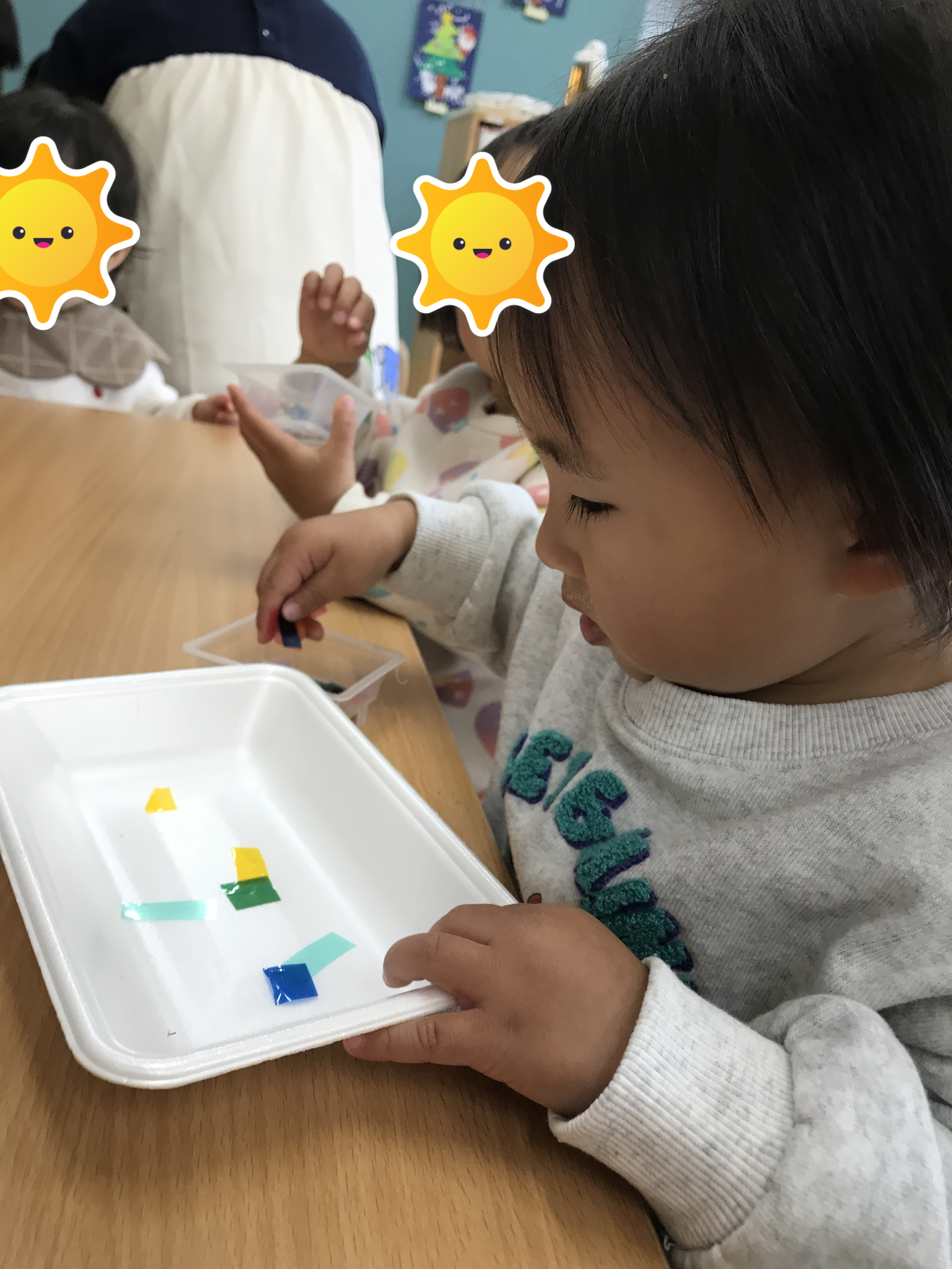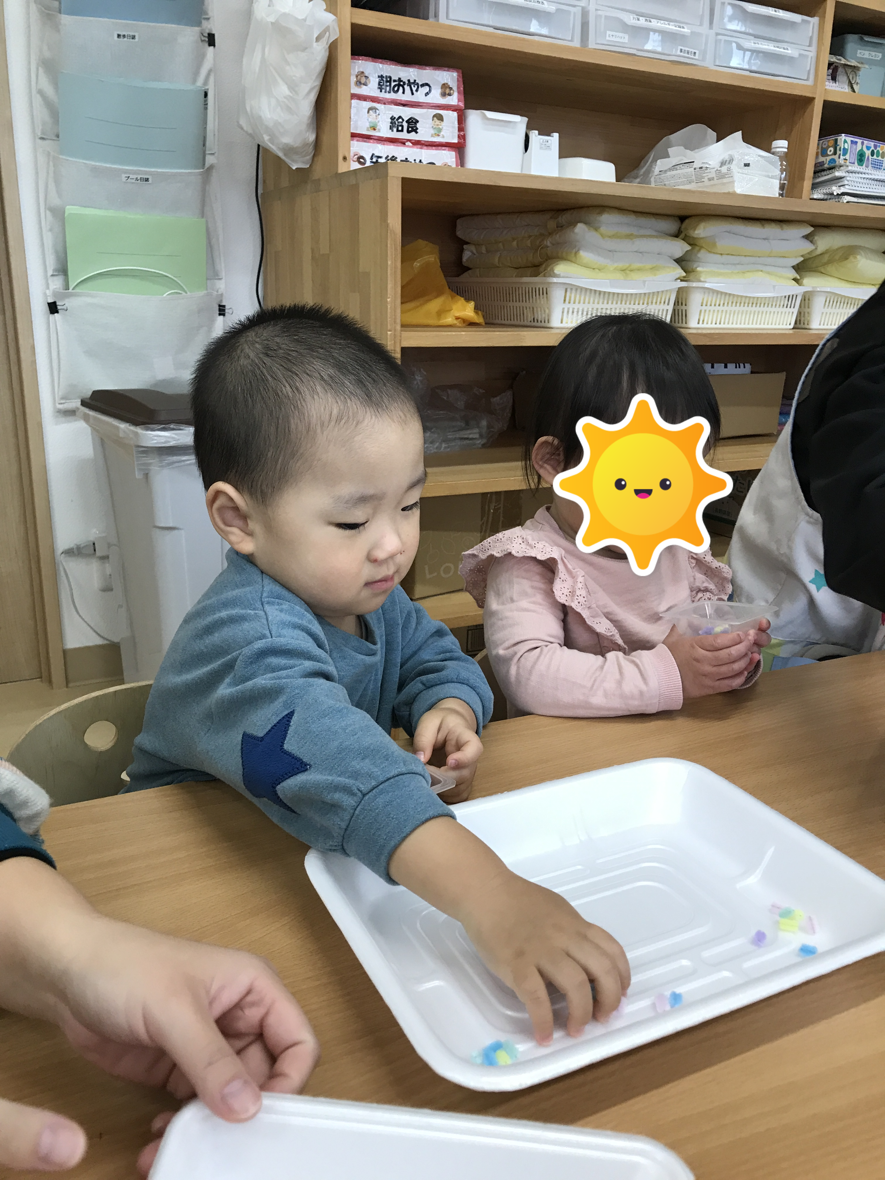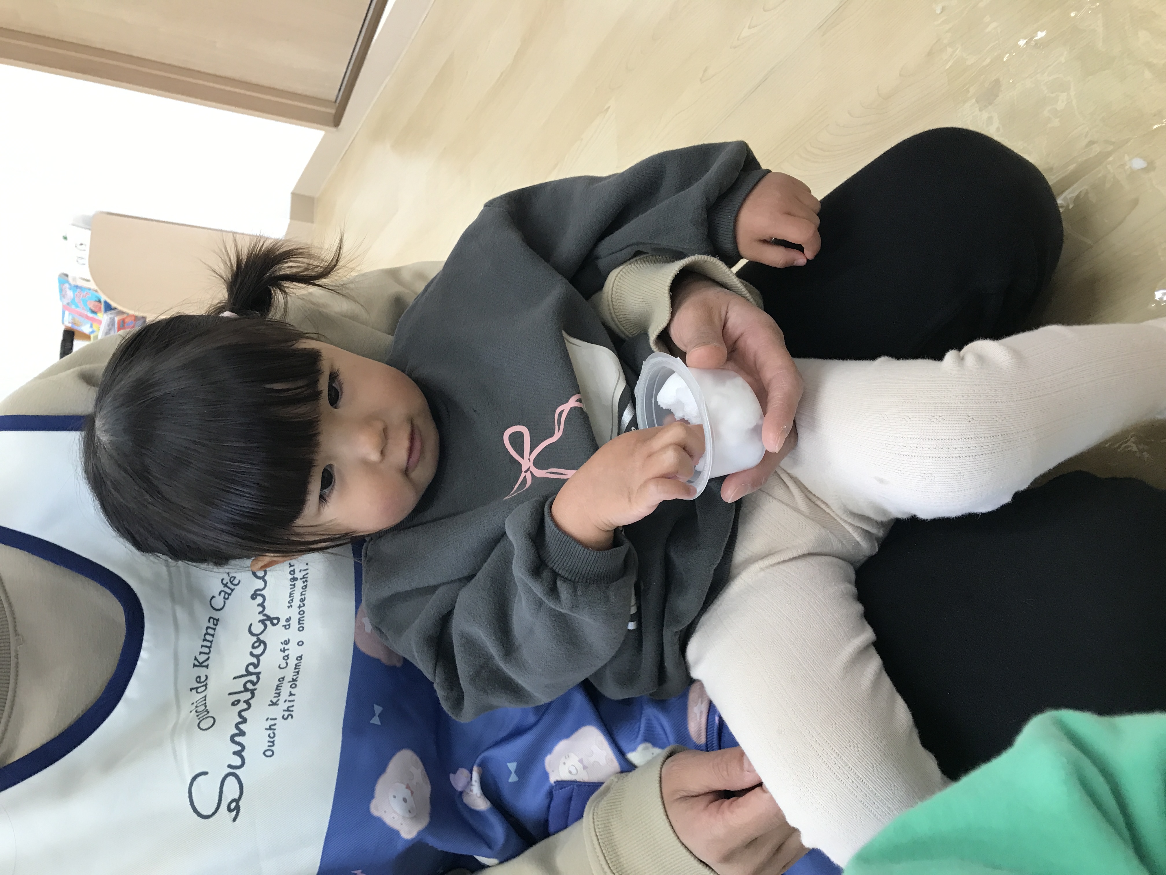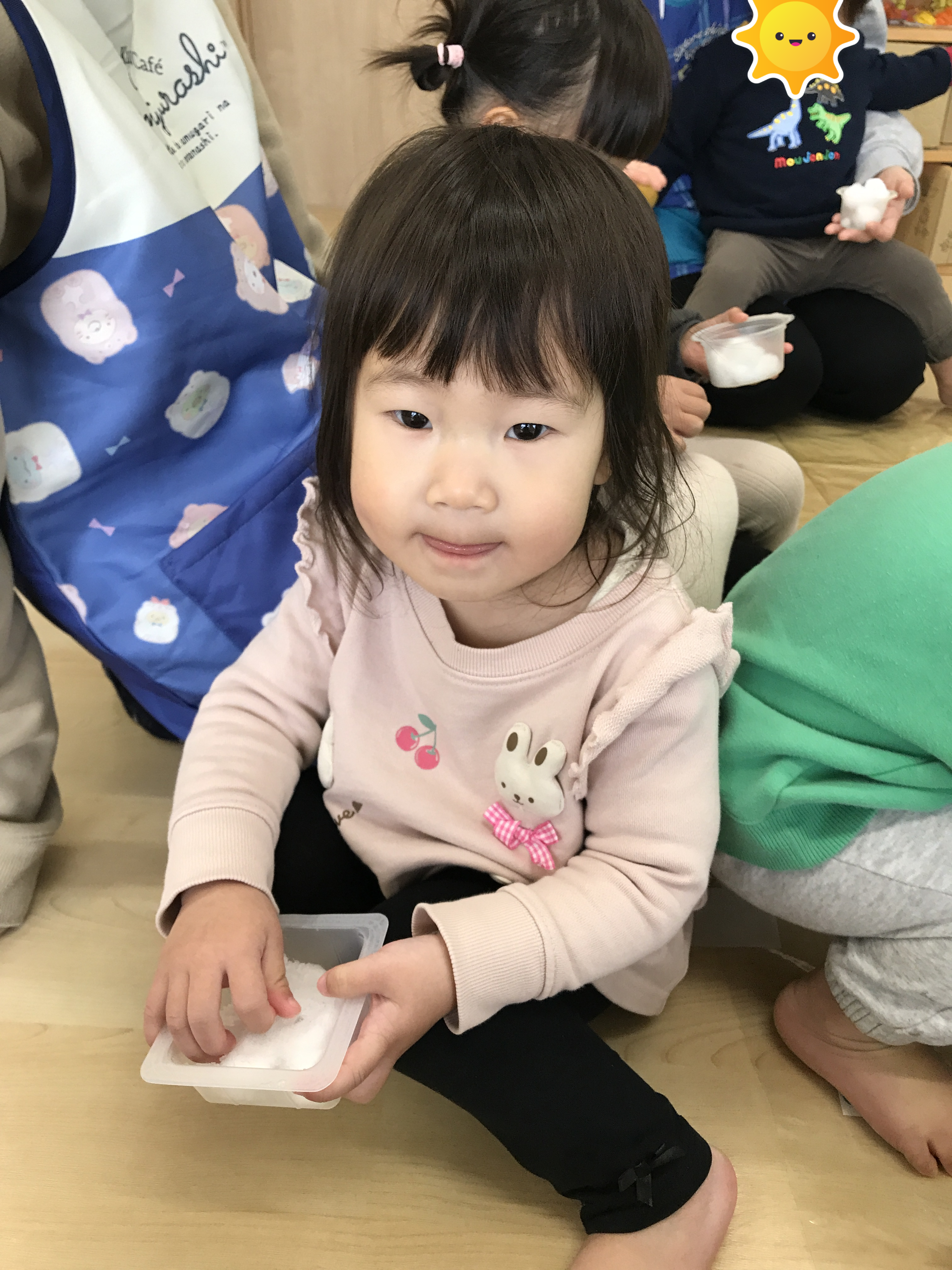 冷たい雪を触ることにちょっぴり抵抗する子もいましたが、カップに入れた雪を保育者がツンツンとすると、興味を示して触ってみようとする子もいました😆