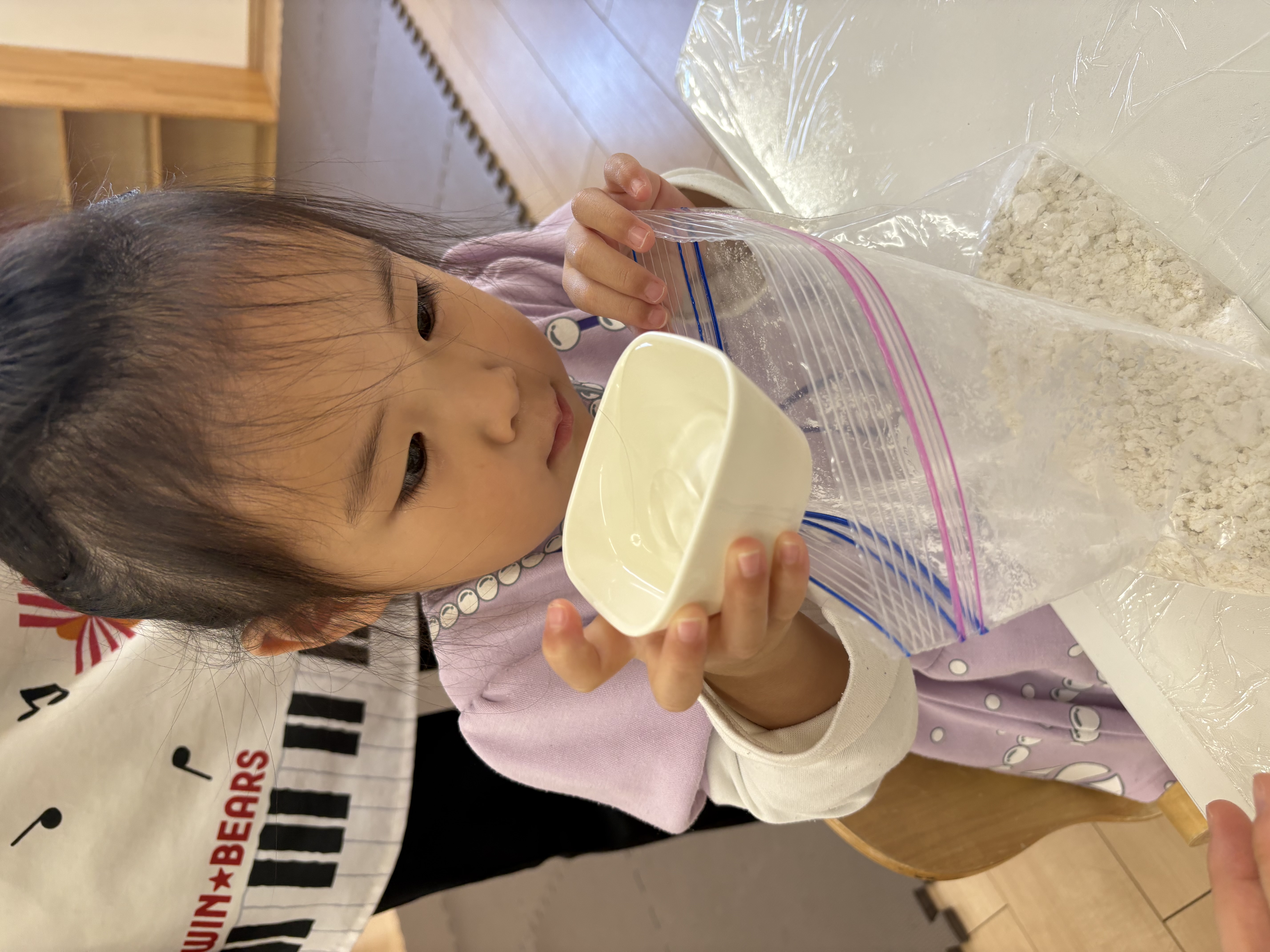 興味津々に先生の説明をしっかり聞き、袋に入った小麦粉に触れると「わ~ふわふわ!」と大興奮💕