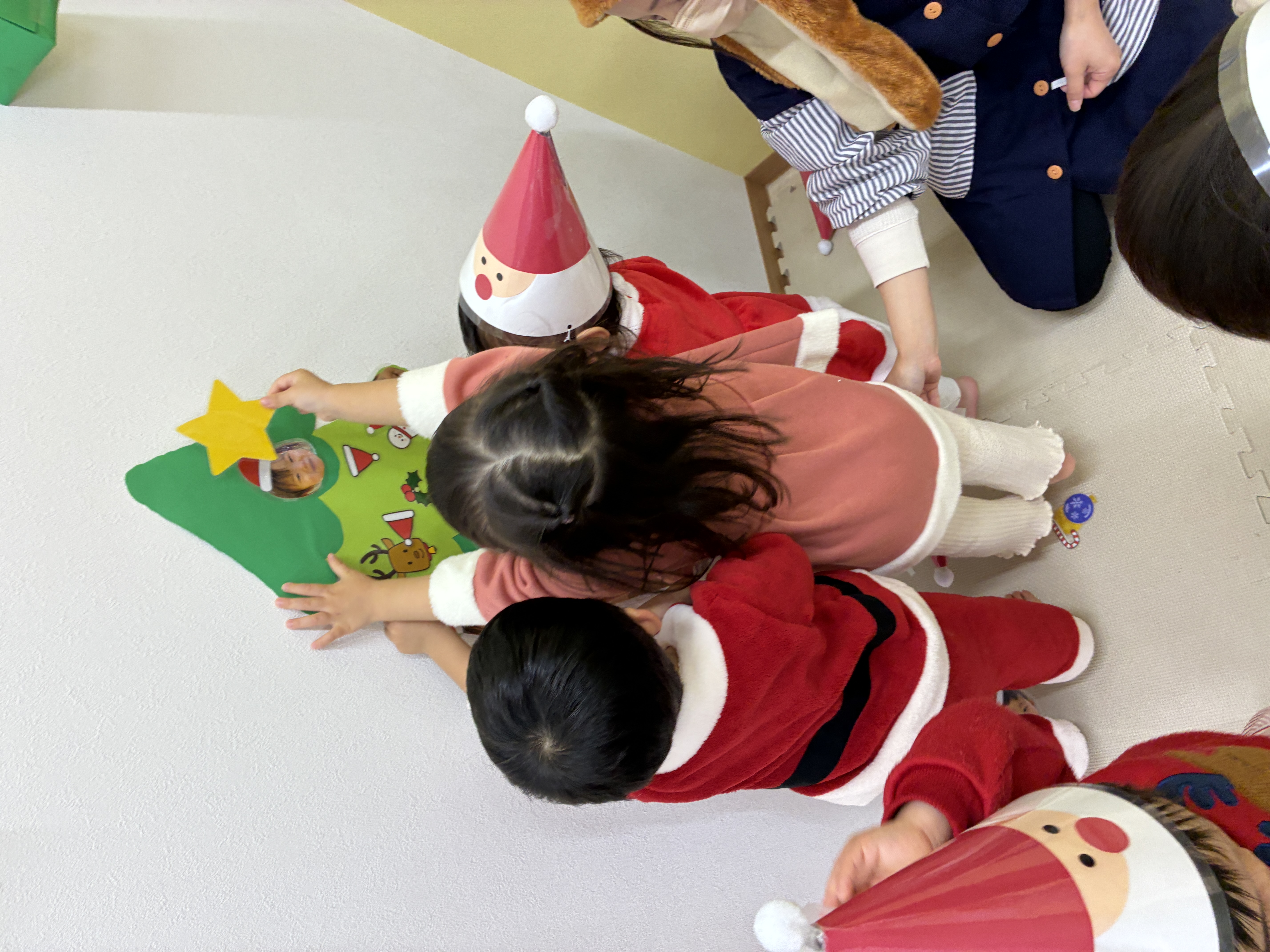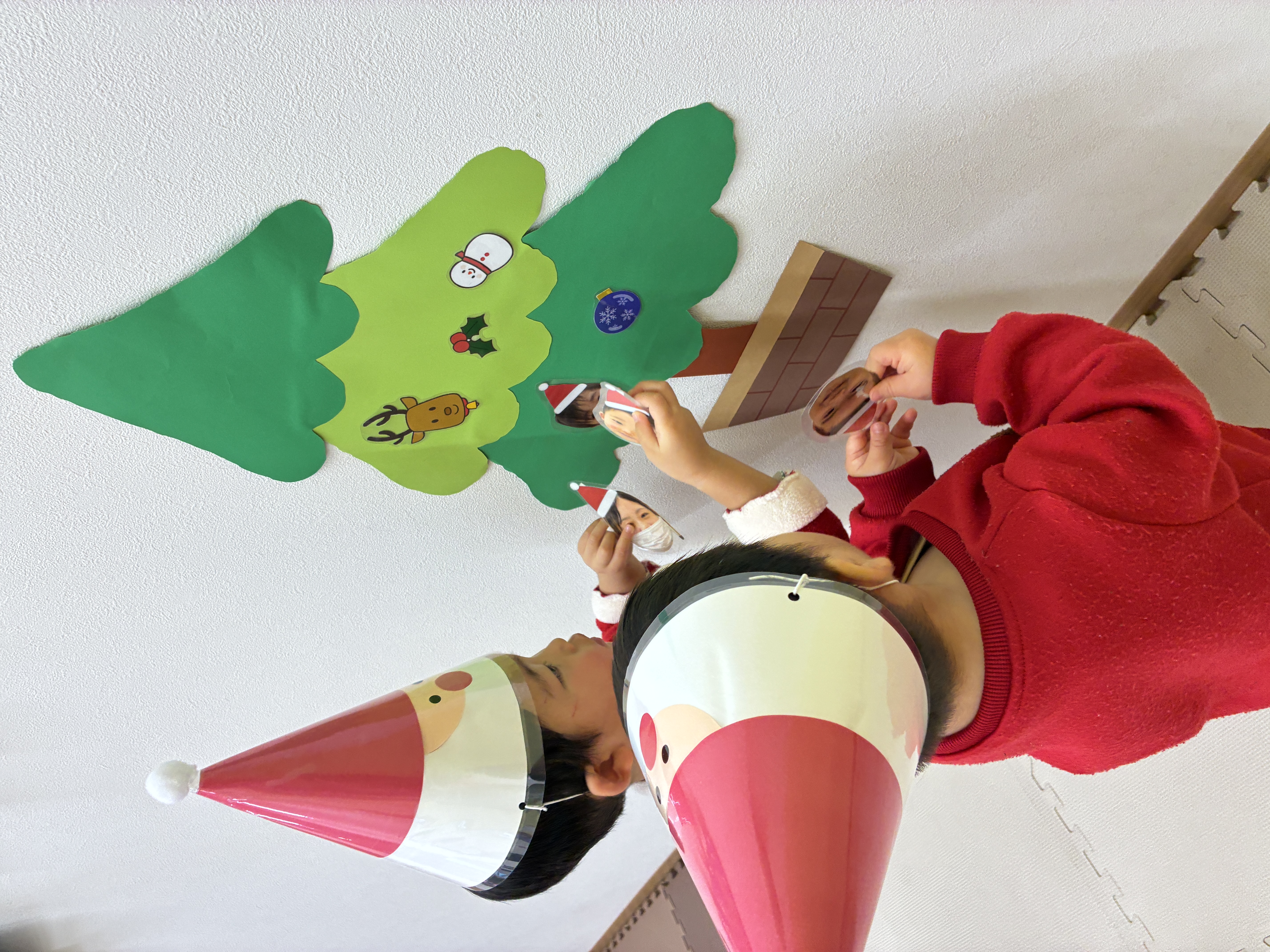 保育室に散りばめられたオーナメントを見つけ、ツリーに飾りつけをしました。