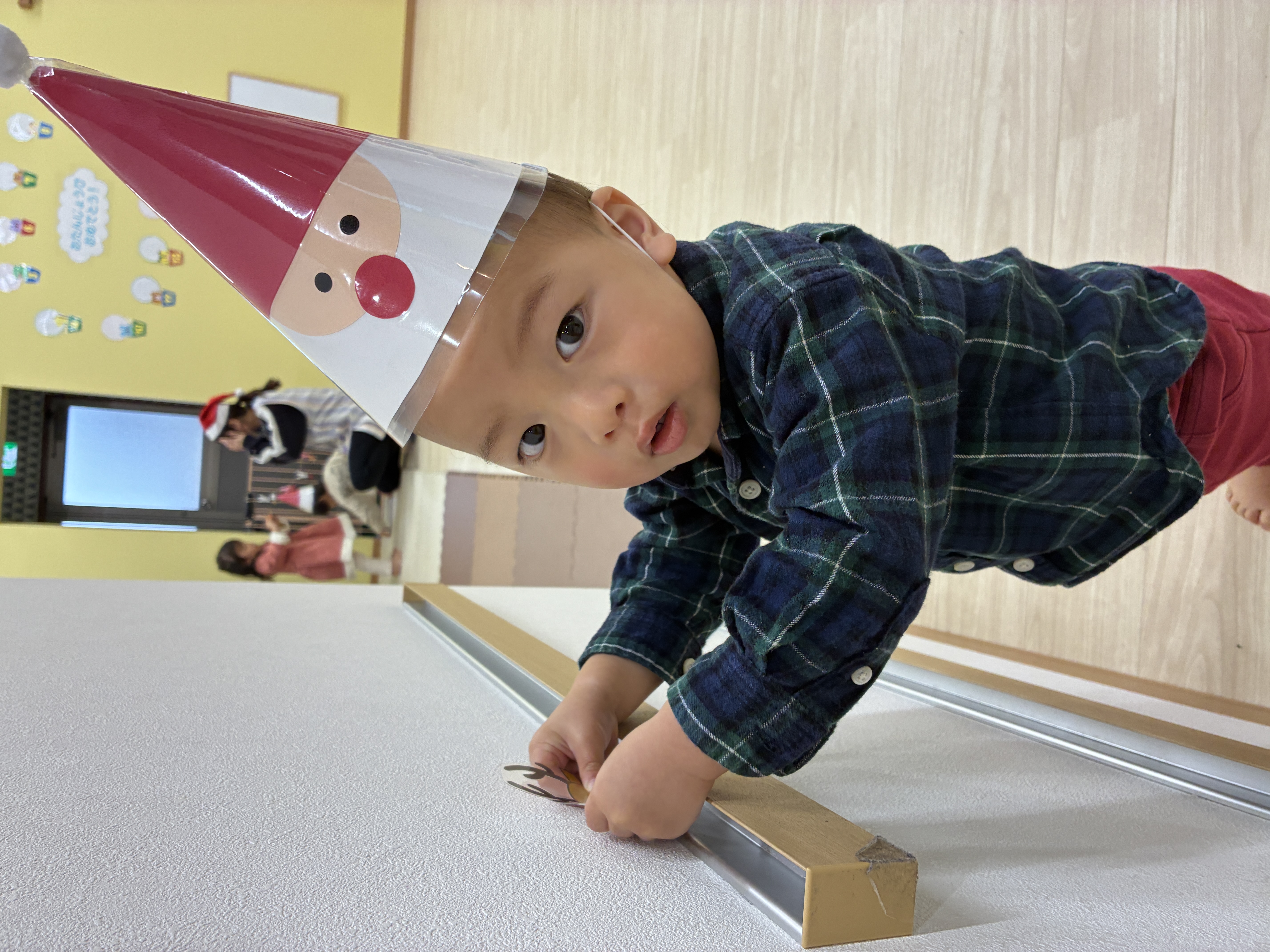 サンタクロースのパーティーハットをかぶり、クリスマス会スタート!