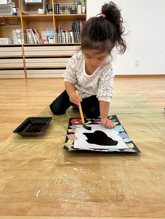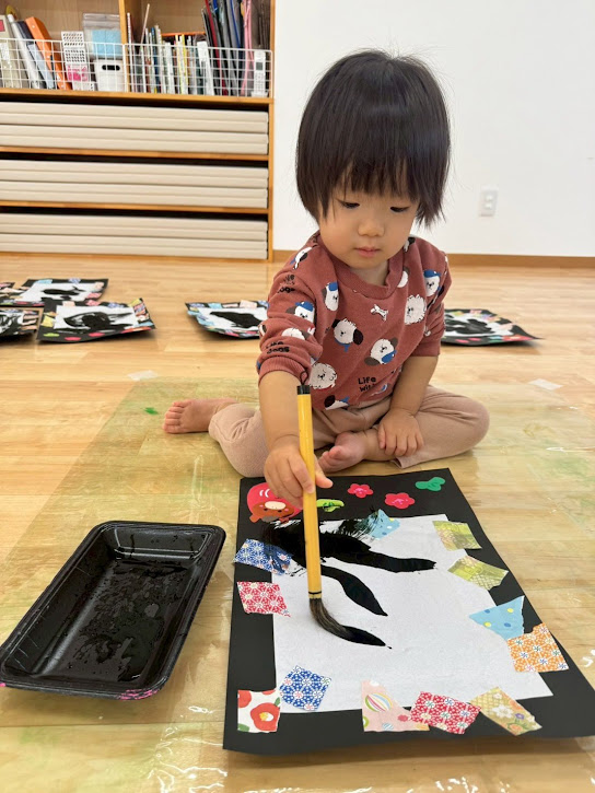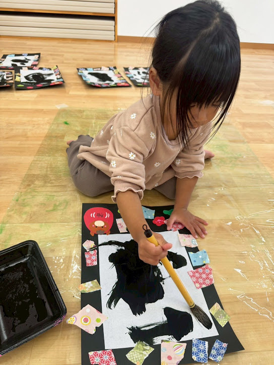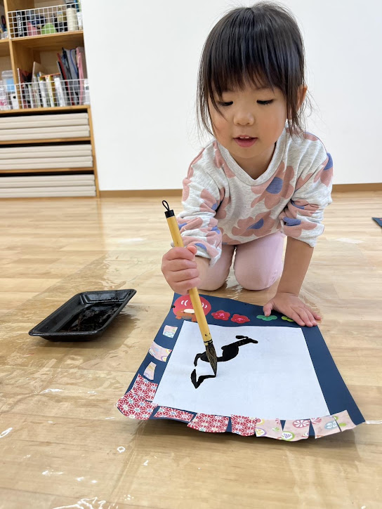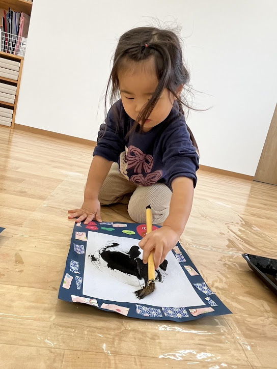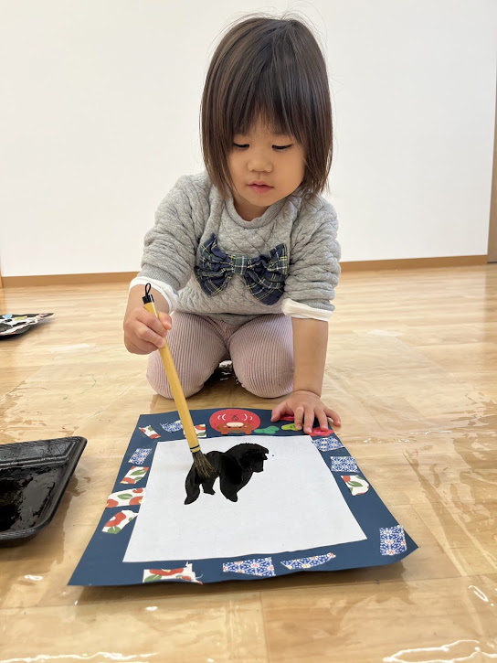 墨が手につくかな~?と少し不安な表情も見せながらも上手に筆を持ちながら